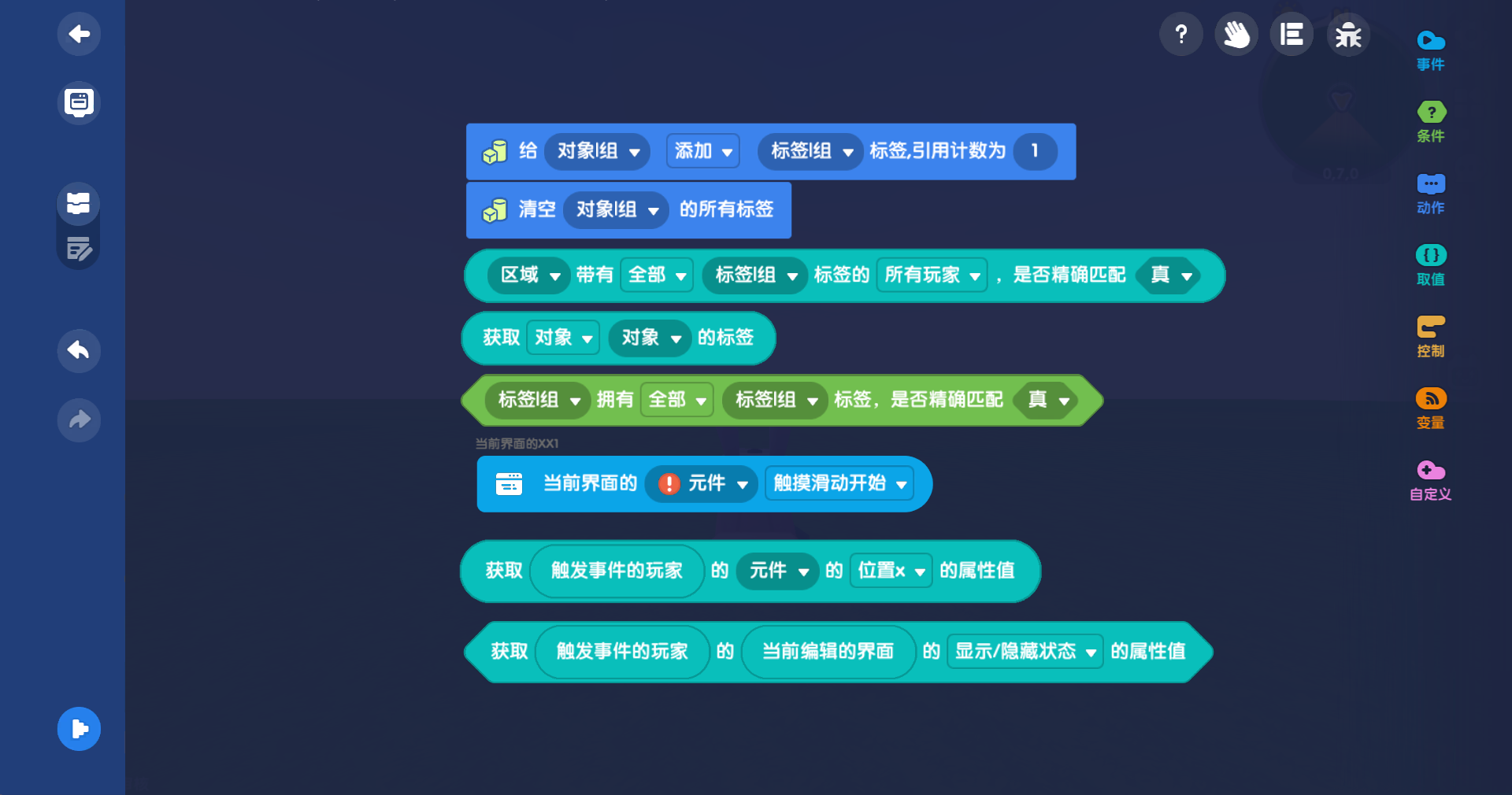 - 数值组, 字符串组,生物类型组,道具类型组,音效组,方块类型组、布尔值组