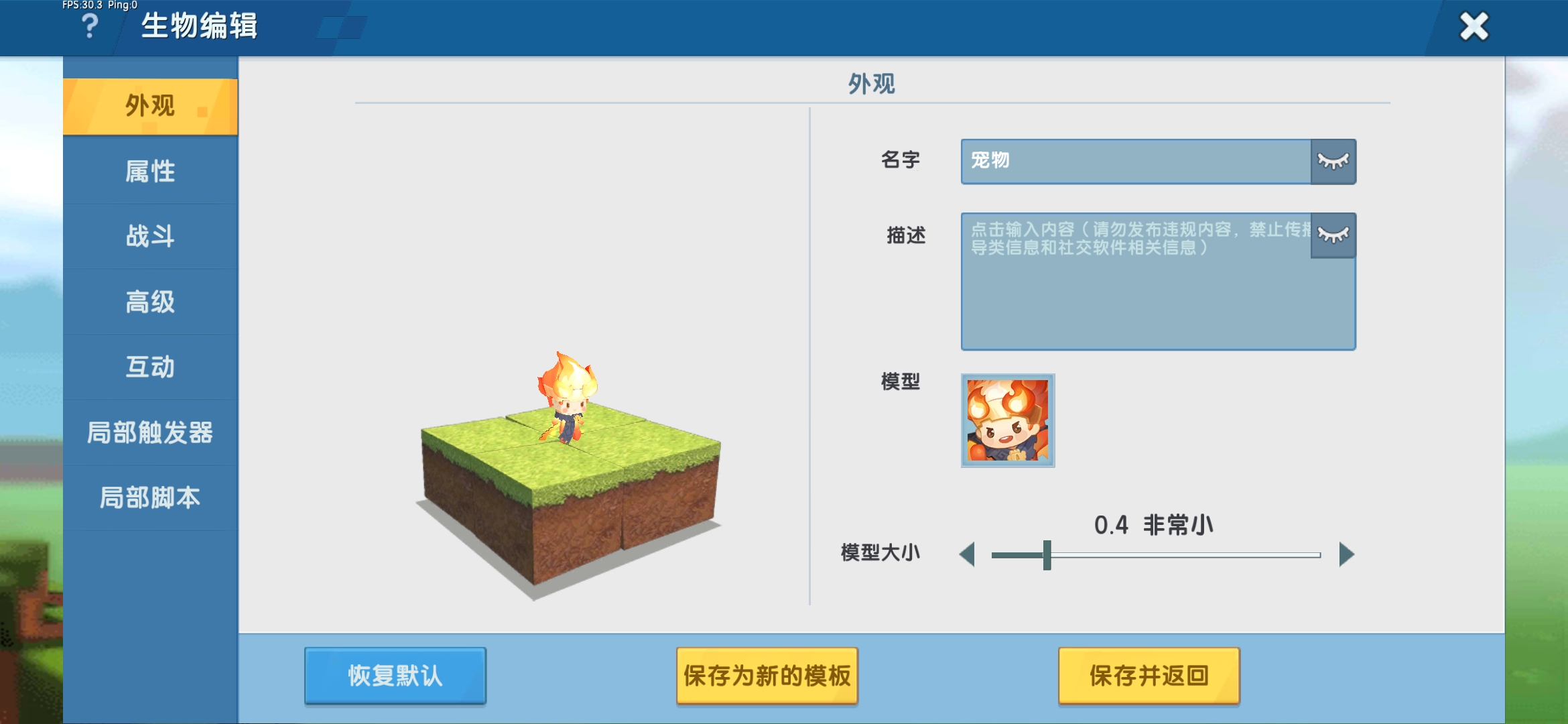 点击新建,添加自己想要的生物模型,并命名为“宠物,模型大小也可以自己修改。