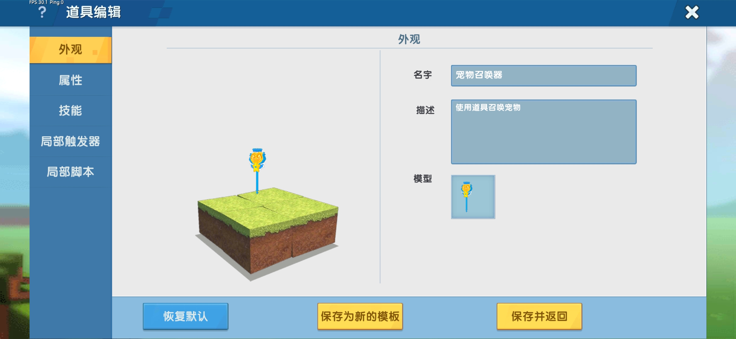 添加道具插件,把道具的模型修改成自己喜欢的微缩模型,并命名为“宠物召唤器”。