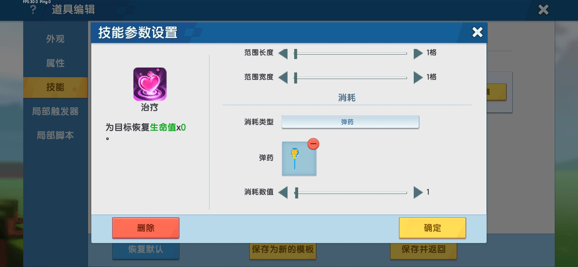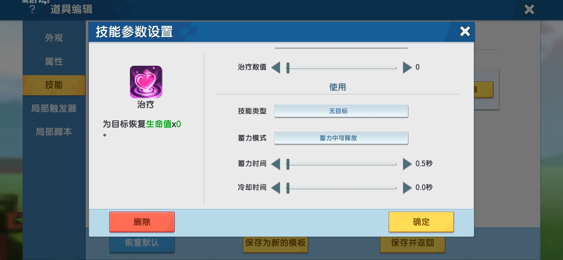 添加道具治疗技能,并在技能参数设置中将治疗数值修改为“0”,蓄力模式为“蓄力中可释放”,蓄力时间,冷却时间均为“0.5秒”。