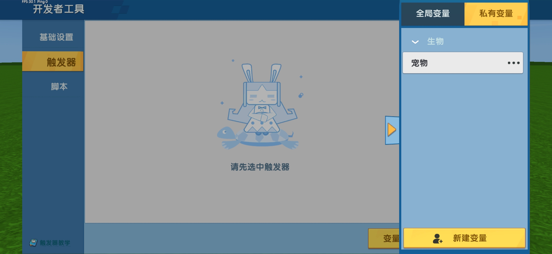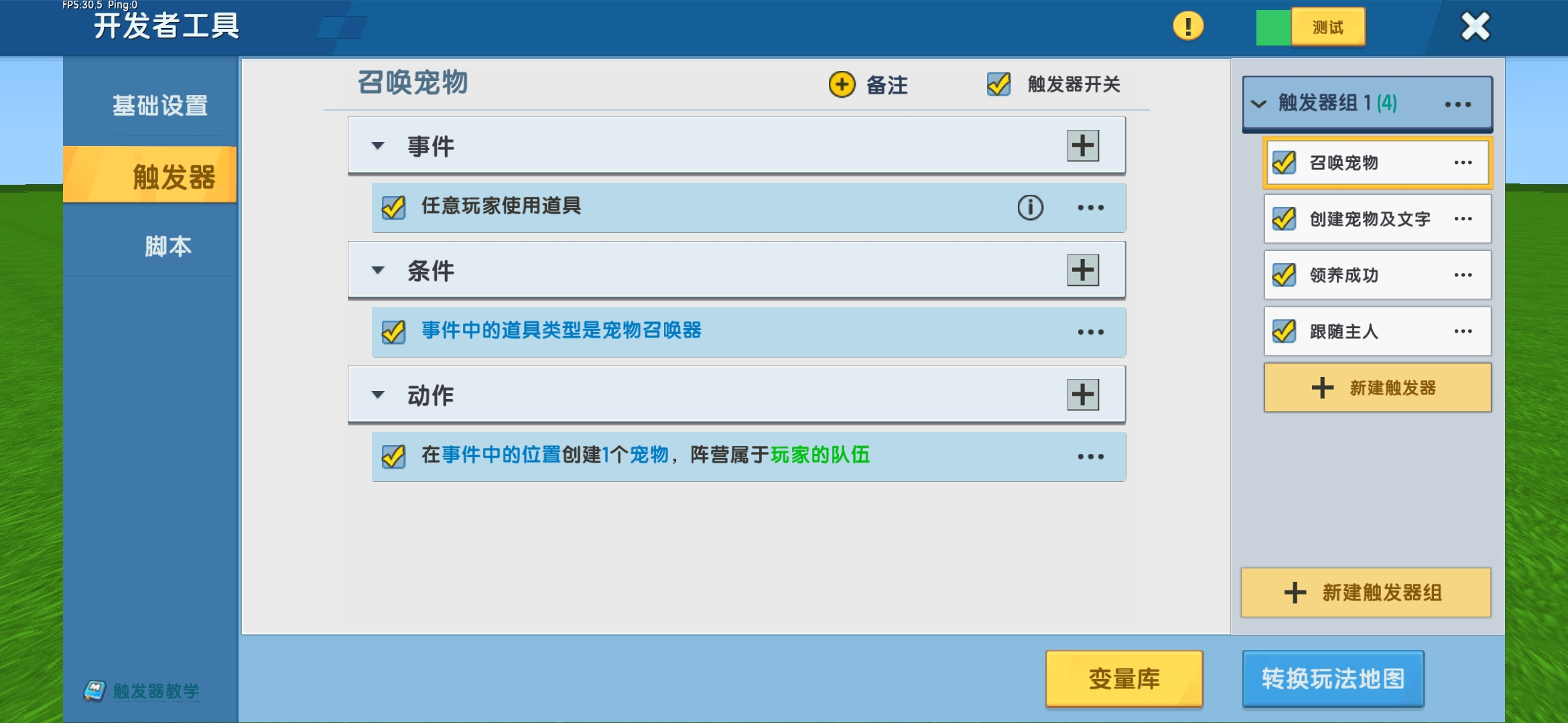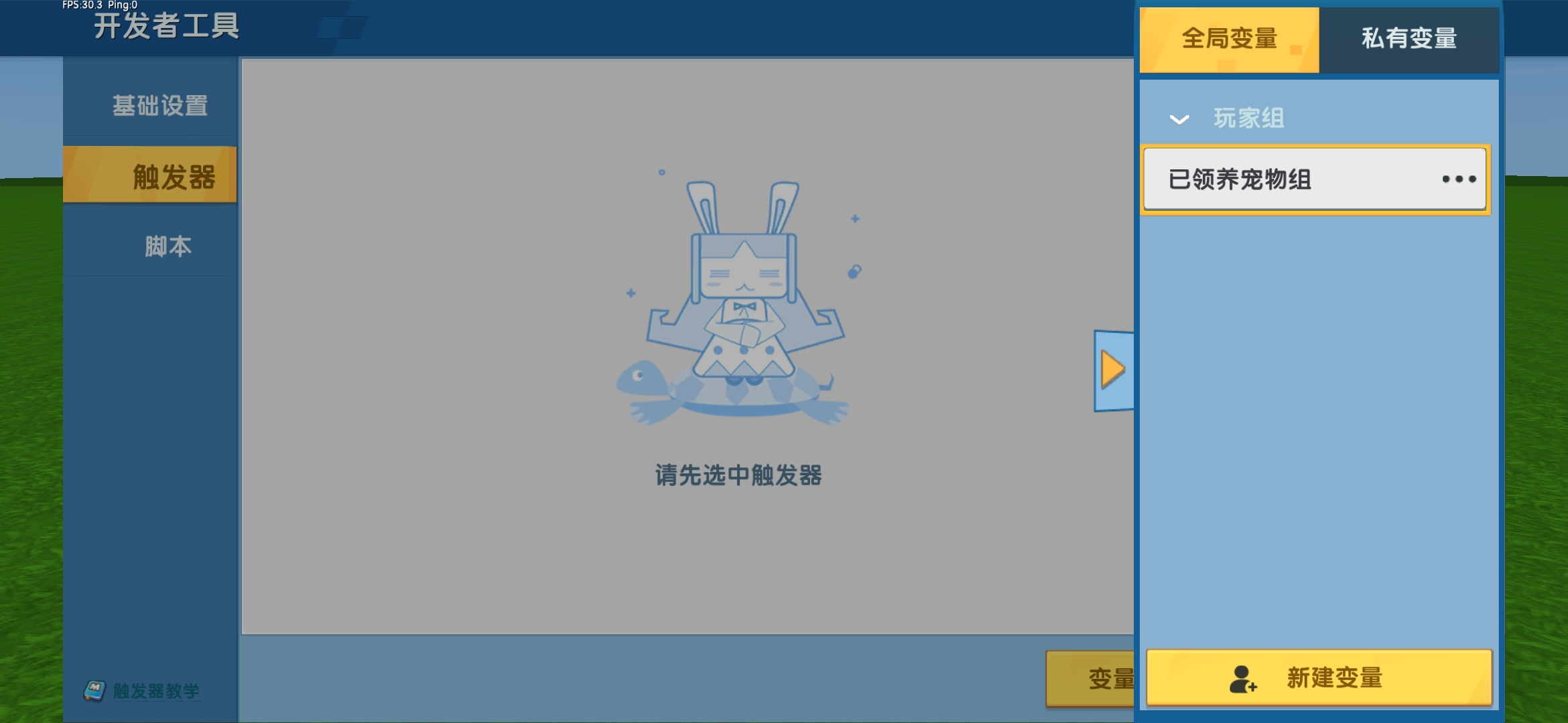 到这里添加插件的任务就完成了,现在开始制作触发器。在设置触发器前先创建一个全局变量【玩家组】命名为“已领养宠物组”,和私有变量【玩家的私有生物】命名为“宠物”。