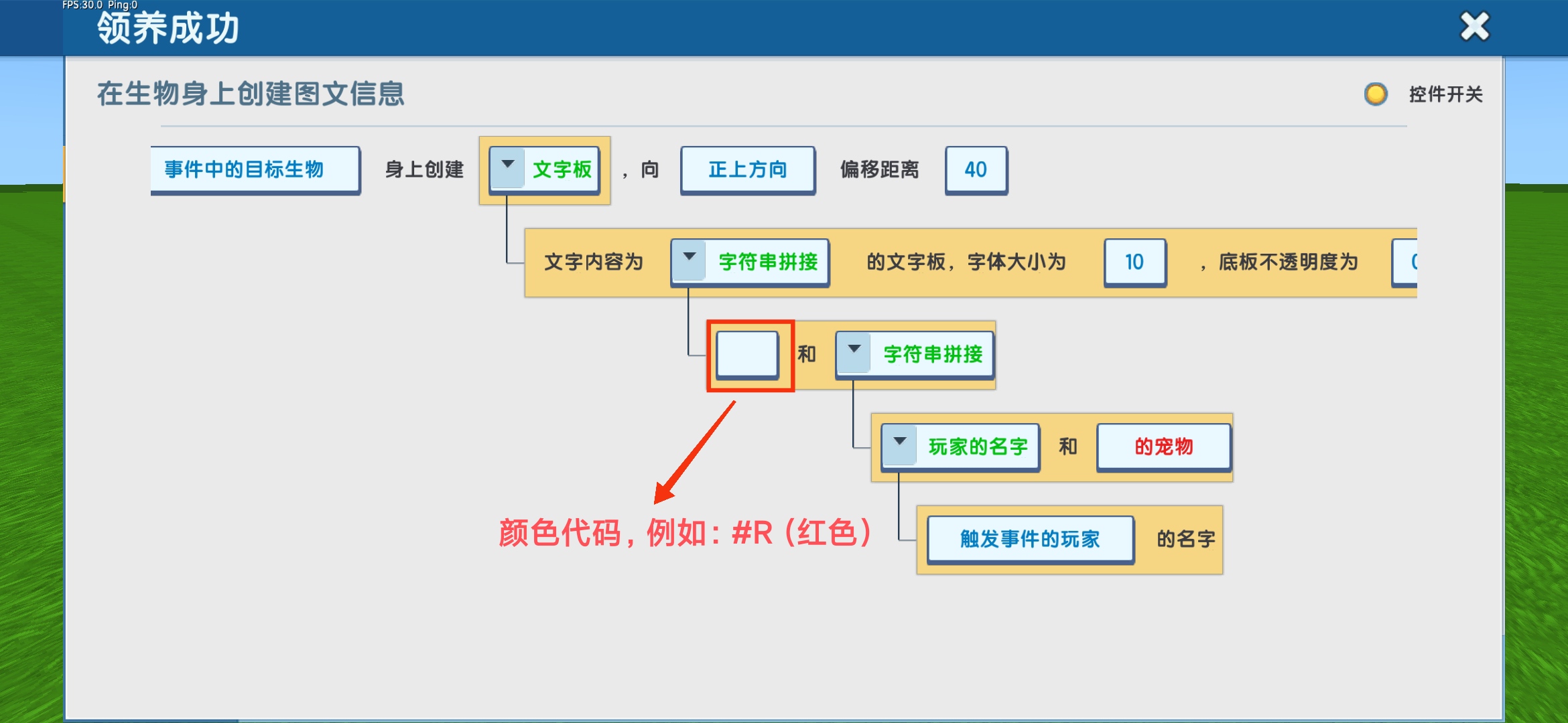 动作2:在生物身上创建图文信息,设置事件中目标生物身上创建文字板(文字内容可以用字符串拼接达到玩家名字展示在生物身上的效果),字体大小为“10”,底板不透明度为“0”。