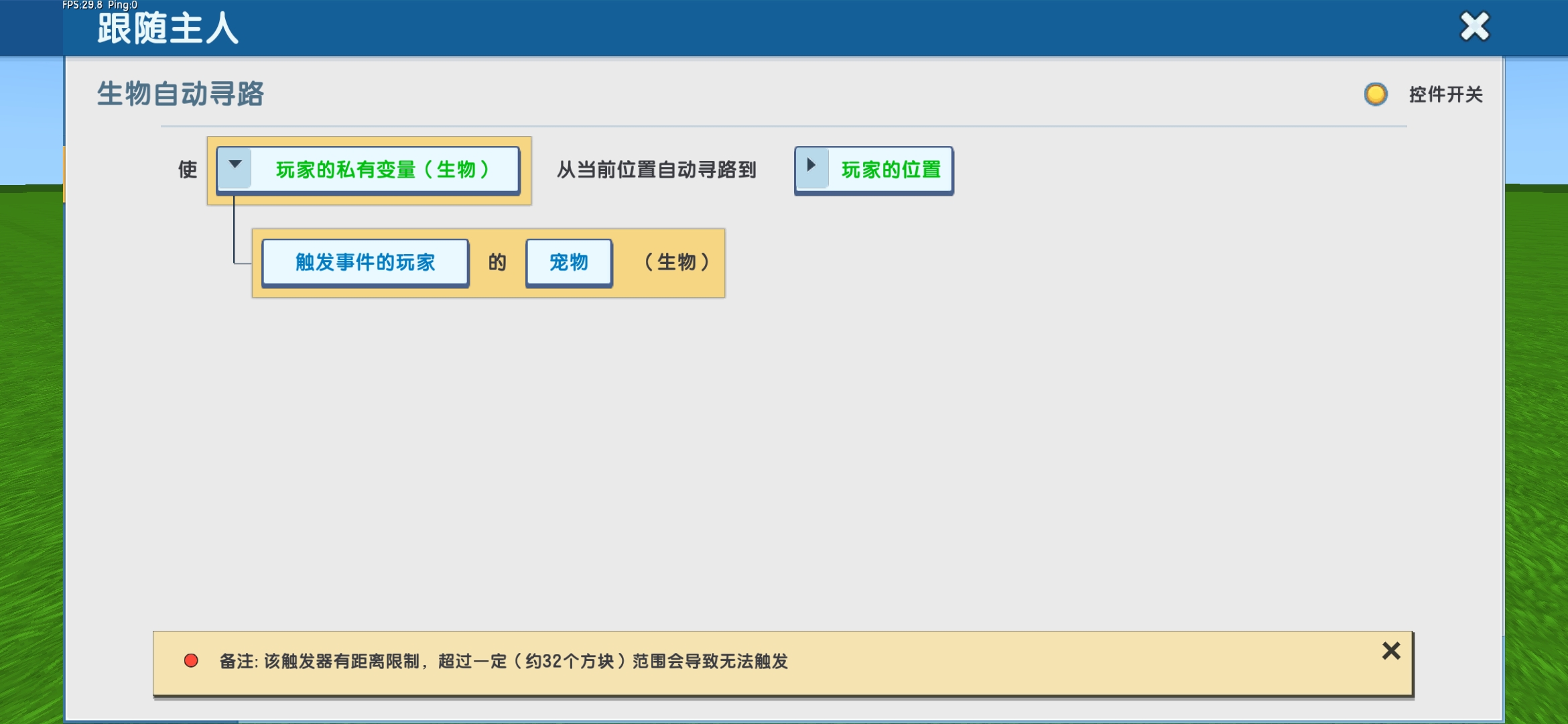 动作:让生物移动寻路,使“玩家私有变量(生物)”从当前位置自动寻路到“触发事件玩家的位置”。