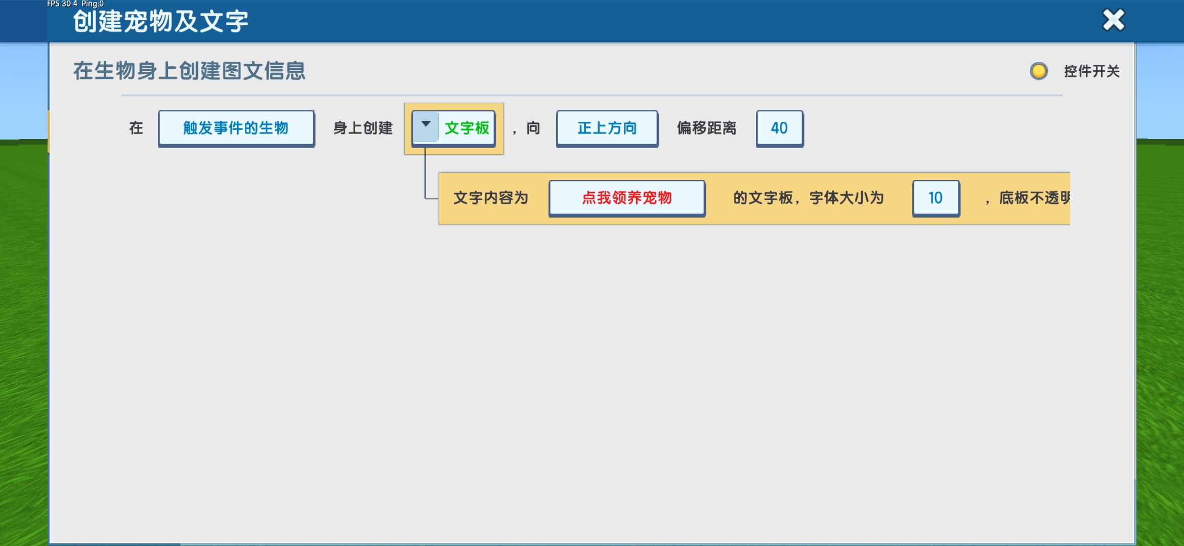 动作1:在触发事件的生物身上创建文字板(文字内容为“点我领养宠物”字体大小为“10”底板不透明为“0”),向“正上方向”偏移距离“40”