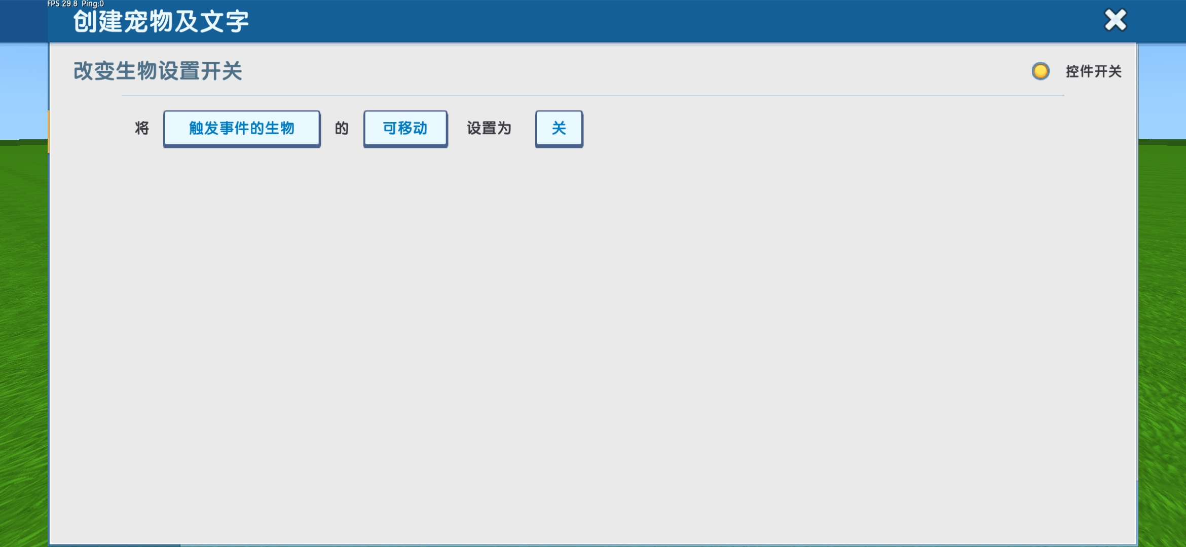 动作2:在触发器—动作—生物中找到“改变生物设置开关”将触发事件的生物的可移动设置为“关”这样创建好的宠物就不会乱动,静候主人点击领养。