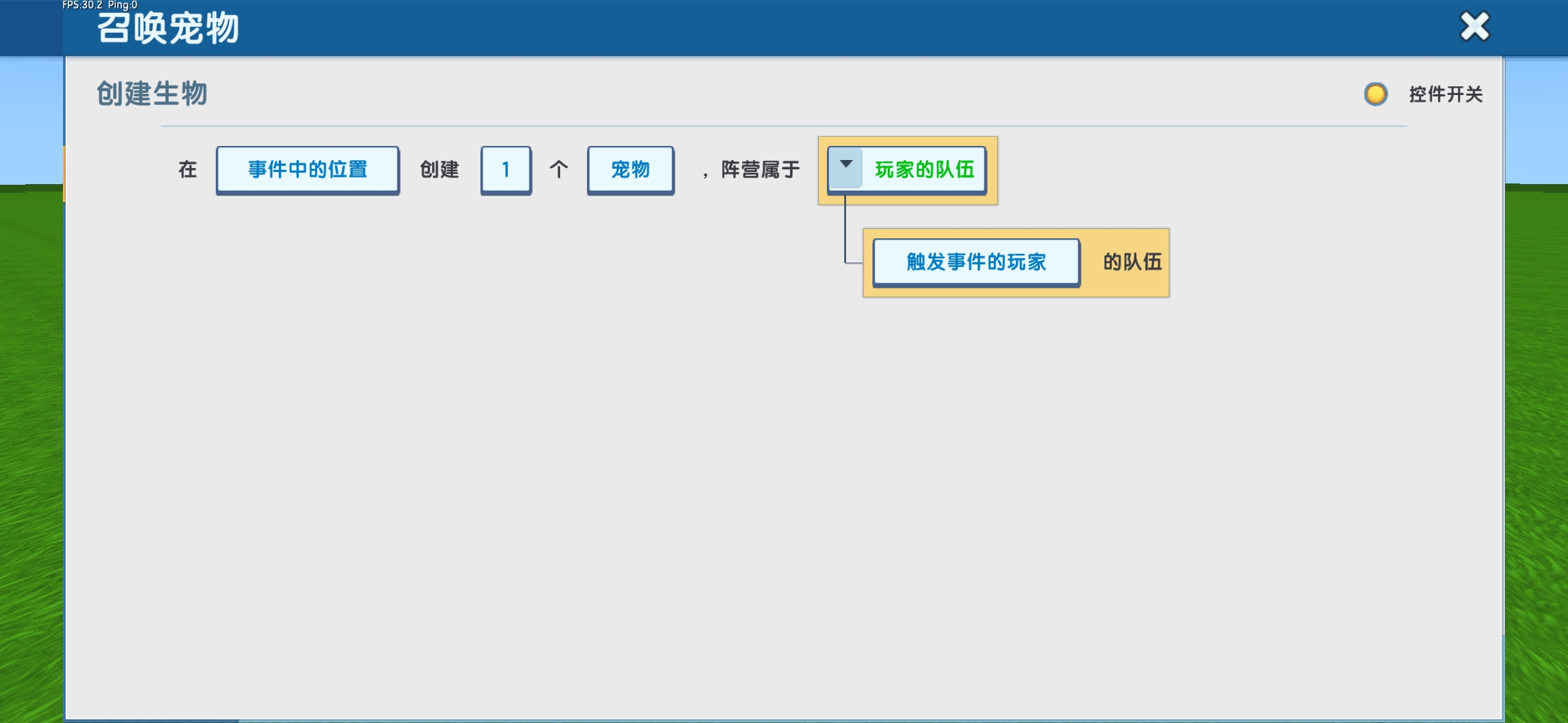 动作:在玩家的位置创建“1”个“宠物”,阵营属于触发事件玩家的队伍。